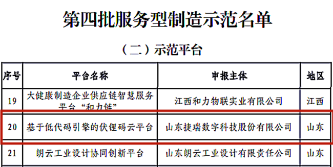 近日,工信部公布了第四批國家級服務型制造示范名單,捷瑞數(shù)字“基于低代碼引擎的伏鋰碼云平臺”成功入選示范平臺。
