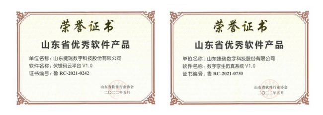 山東省軟件行業協會組織開展“2022年度山東省優秀軟件產品”征集工作,捷瑞數字“伏鋰碼云平臺”、“數字孿生仿真系統”在省軟件產業發展過程中做出突出貢獻,成功入選山東省優秀軟件產品。