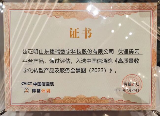 7月27日,由中國信通院主辦的“2023數字生態發展大會”暨中國信通院“鑄基計劃”年中會議在京召開。大會公示了2023 高質量數字化轉型產品及服務全景圖(上半年),由捷瑞數字自主研發的伏鋰碼云平臺成功入選,以賦能推動各行業數字化轉型升級。