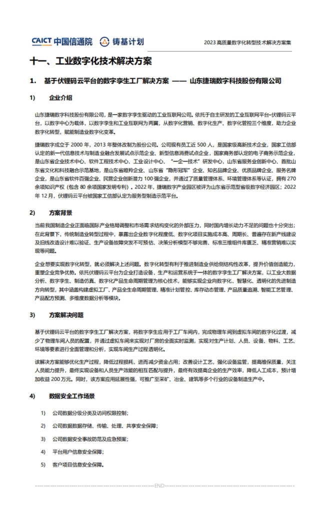 近日,中國信息通信研究院“鑄基計劃”《2023高質量數字化轉型技術解決方案集(第一版)》(以下簡稱“《方案集》”)正式發(fā)布,遴選出一批具有產業(yè)推廣應用效應的企業(yè)數字化轉型技術方案,旨在推動數字經濟時代社會生產方式、生活方式及治理方式變革。由捷瑞數字打造的《基于伏鋰碼云平臺的數字孿生工廠解決方案》成功入選,為加快企業(yè)數字化轉型進程提供了強有力的支持。