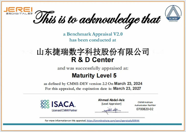 近日,經國際權威機構評估,捷瑞數字順利通過全球軟件工程領域CMMI5級認證。這一認證標志著捷瑞數字在軟件產品研發、項目管理、技術提升等方面已達到國際軟件企業水平,能夠為客戶提供更成熟、高效的行業解決方案以及更高質量的產品和服務。